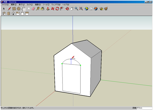 @ [円弧]ツールを選択し、長方形の上側の2つの頂点を指定した後、3点目でアールの大きさを指定する。長方形の上の辺は削除する([消しゴム]ツールまたは[選択]ツールで選択後deleteキー)